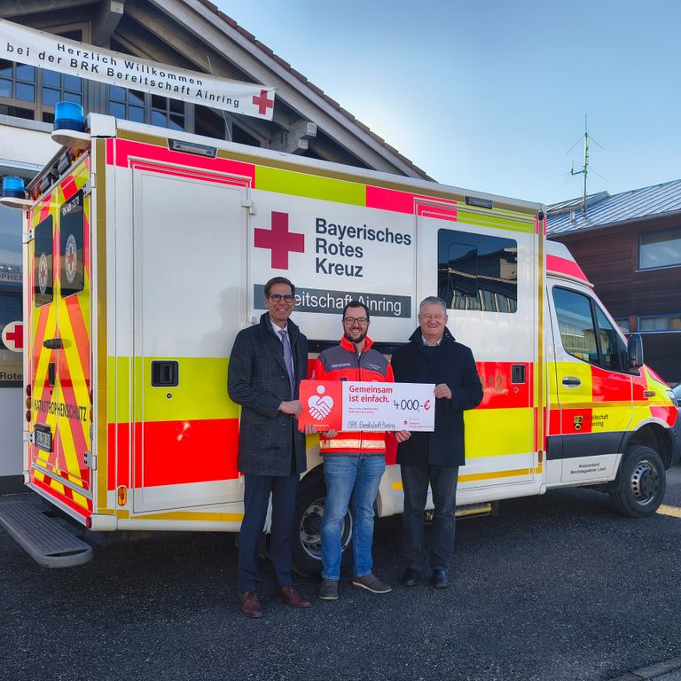 Die Sparkassen-Bürgerstiftung Berchtesgadener Land überreichte kürzlich eine Spende von 4.000 Euro an die ehrenamtliche BRK-Bereitschaft Ainring. Diese und weitere Spenden ermöglichten die Ersatzbeschaffung eines dringend benötigten Notfallkrankenwagens. Das 15 Jahre alte Fahrzeug, das zuvor im regulären Rettungsdienst eingesetzt war, hatte eine hohe Laufleistung erreicht und größere Reparaturen waren nicht mehr wirtschaftlich vertretbar.