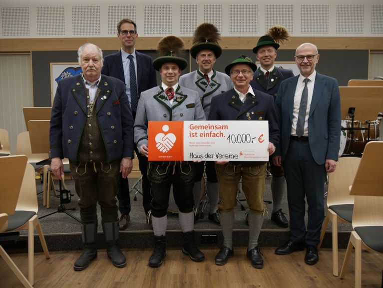 Dank der Unterstützung der Gemeinde Bischofswiesen sowie zahlreicher Förderer und Spender konnte das Projekt zügig umgesetzt werden. Um die Innenausstattung zu finanzieren - etwa elektronische Schießstände für die Schützen, Stühle samt Notenständern für den Musikverein sowie Möblierung und eine Musikanlage für den Trachtenverein - überreichten Stiftungsrat Helmut Grundner und Stiftungsvorstand Alexander Gehrig im Namen der Sparkassen-Bürgerstiftung Berchtesgadener Land einen Spendenscheck über 10.000 Euro an die Vorstände der drei Vereine. Beide freuten sich, damit einen Beitrag zum Erhalt der regionalen Heimatkultur leisten zu können.
